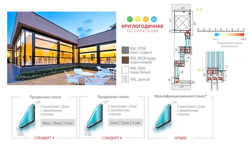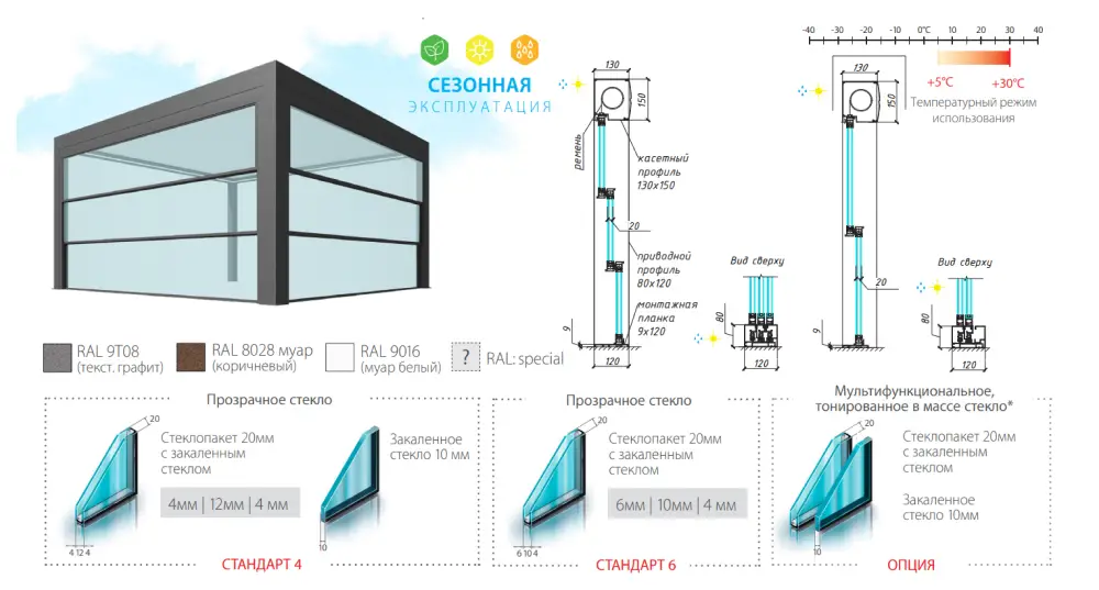 Регулируемые встроенные фильтры обеспечивают постоянный приток свежего воздуха даже при полностью закрытых окнах. Тёплый профиль утеплит помещение на 50%, поэтому в холодный сезон площадку можно оборудовать ИК – обогревателем и использовать её круглый год. Это особенно актуально для ресторанов и кафе.